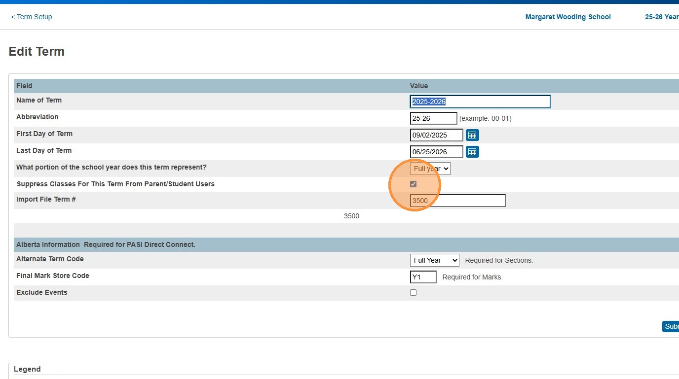 7. Check the box for "Supress Classes For This Term From Parent/Student Users"