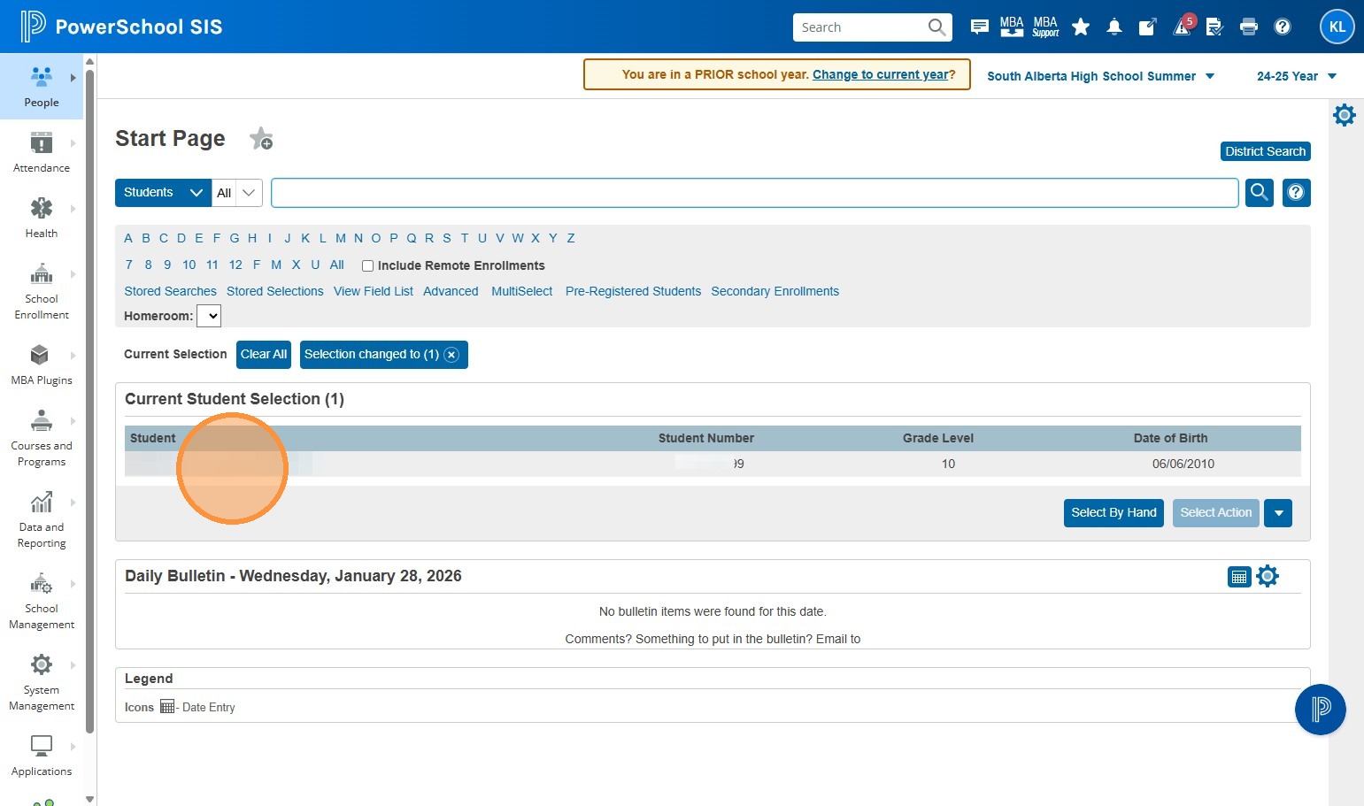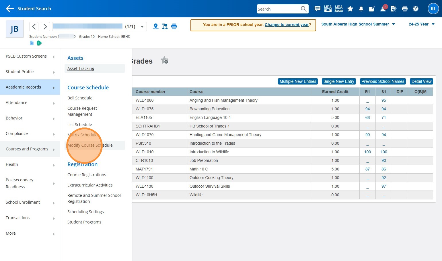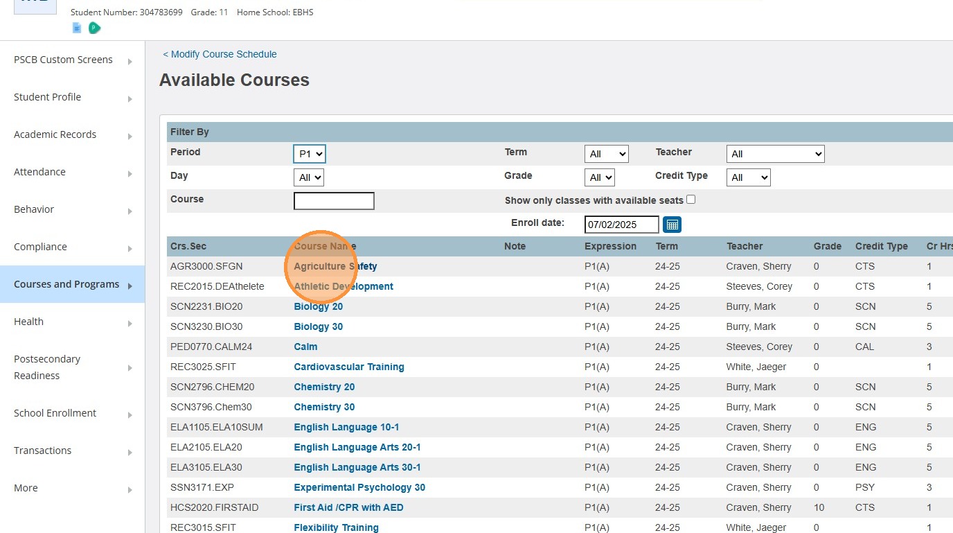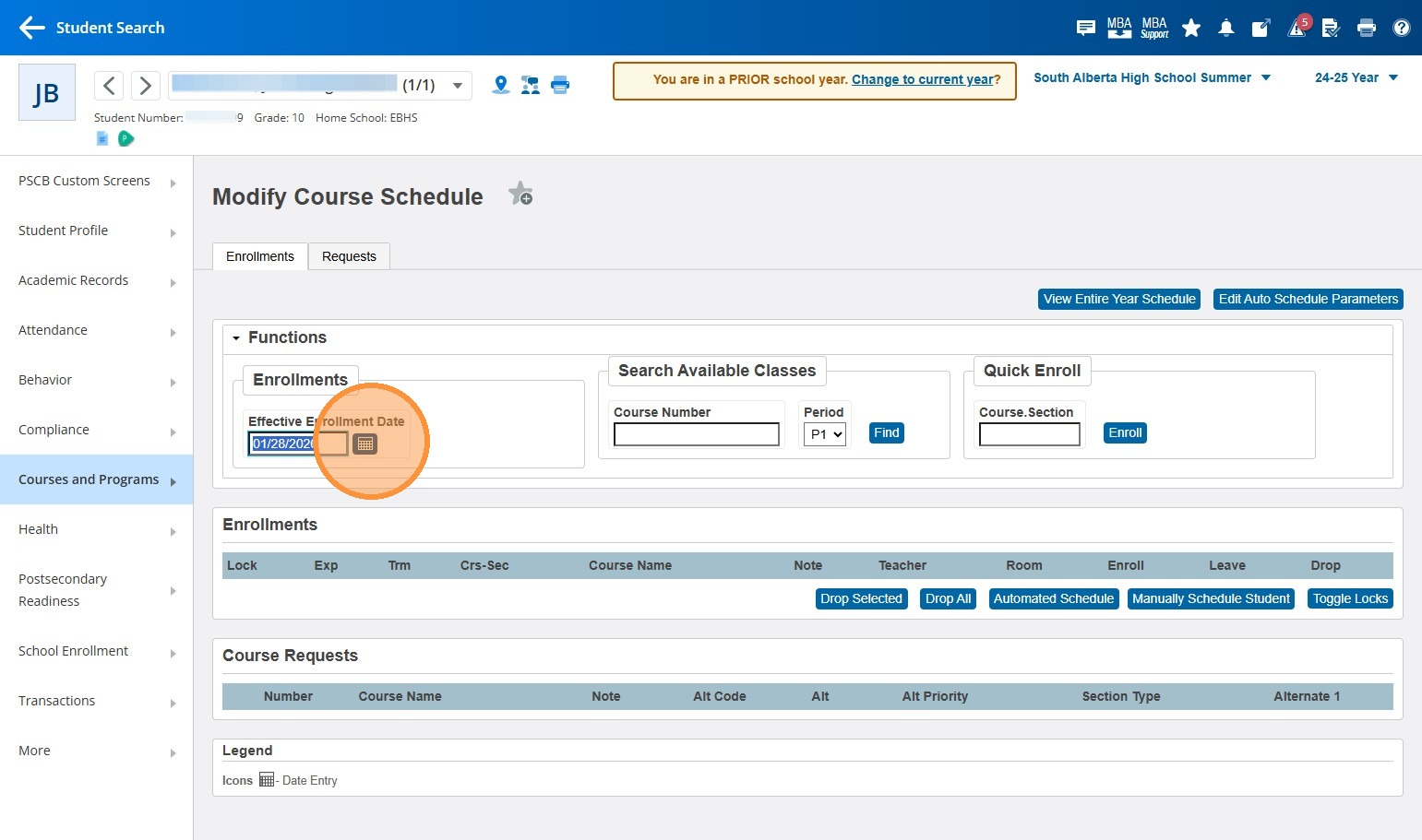 6. Grab and copy (right click -> Copy or highlight and cntrl + c) the ASN of the student you need to enroll in previous year summer courses.
