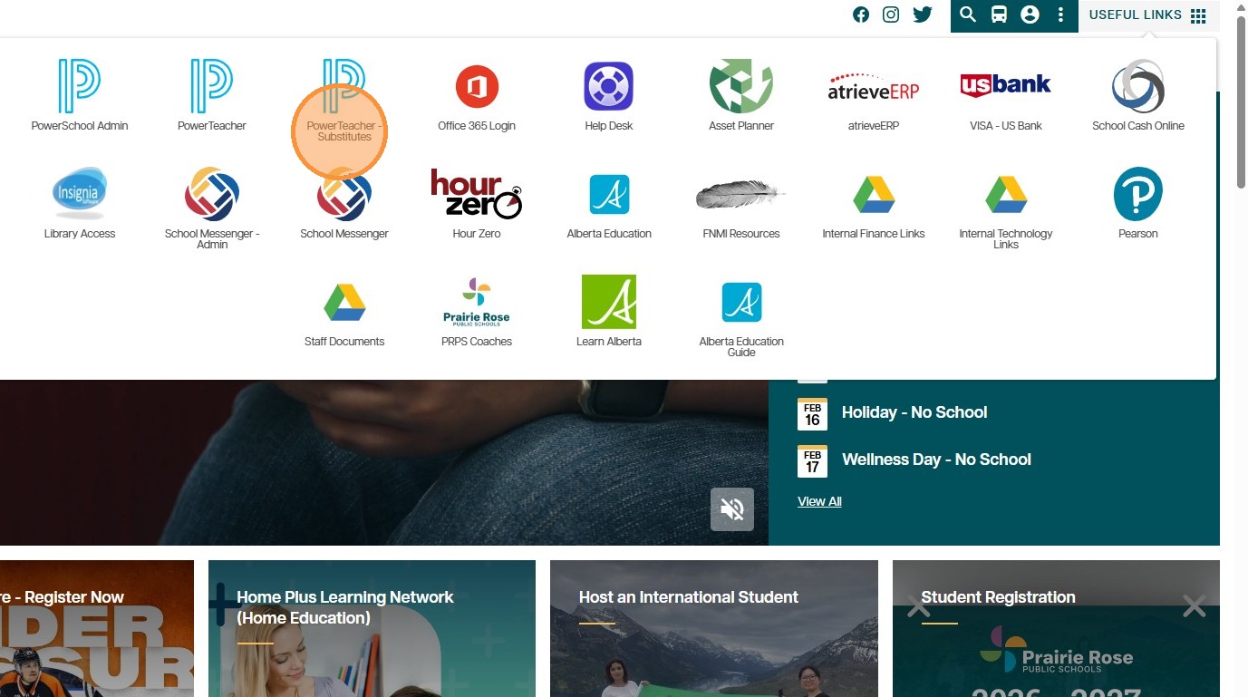 7. Subs can login by going to the Prairie Rose Home Page (myprps.com) and clicking Useful Links in the upper right corner (they will need to be signed in to the website using their Prairie Rose email address), Then clicking "PowerTeacher - Substitutes".