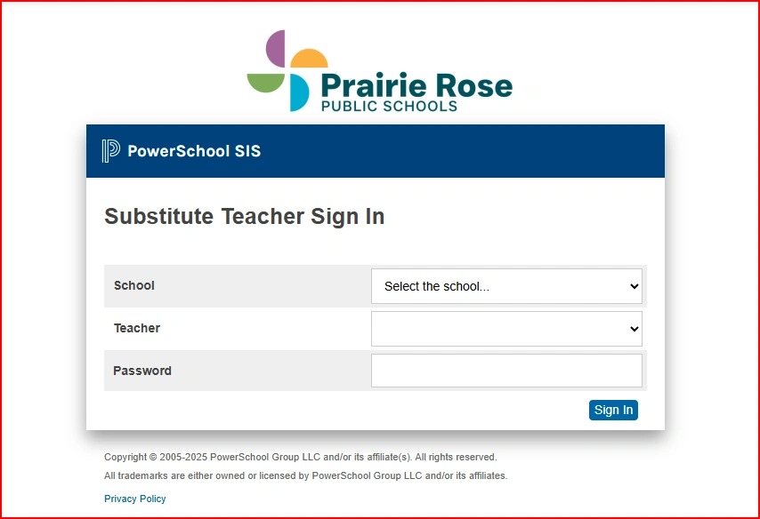 The Sub Portal Login is as displayed below. The Sub simply needs to choose the school, the teacher, and enter the password for your school.