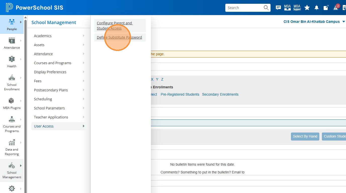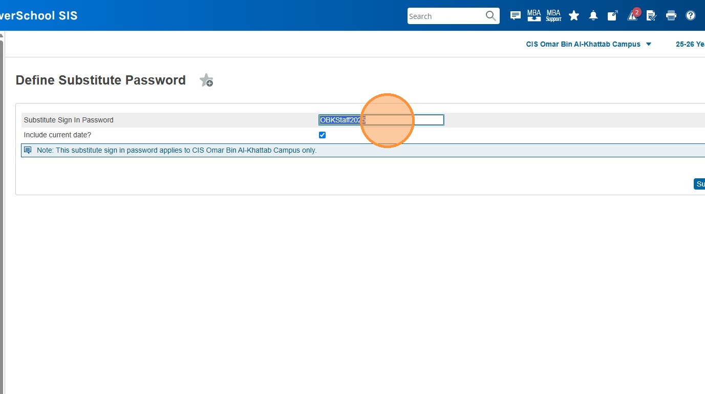 5. This field will show the current Sub Portal password. To change/set it, simply click in this field and enter a new password. You can choose whether the sub logging in will need to enter the current date as well or not by toggling the checkbox below. This is the password you'd provide to the subs to sign in to the PowerSchool Sub Portal.
