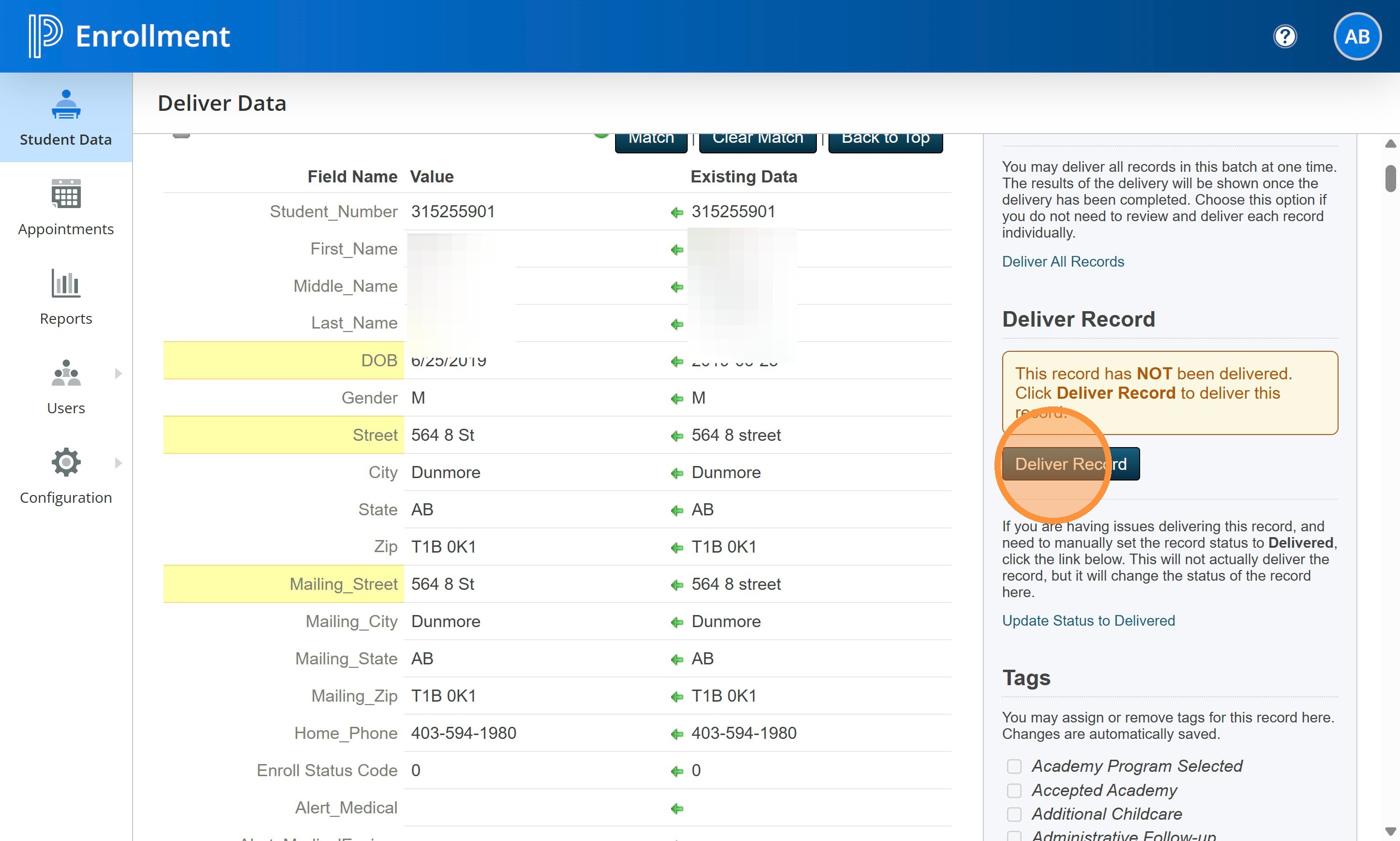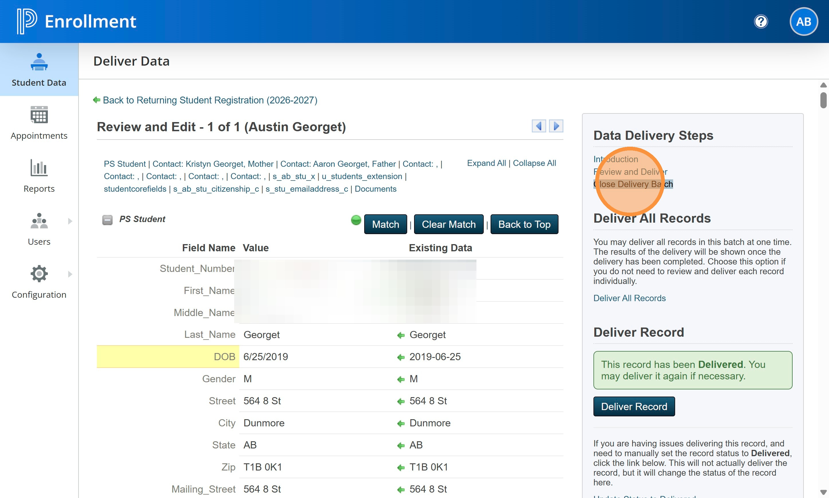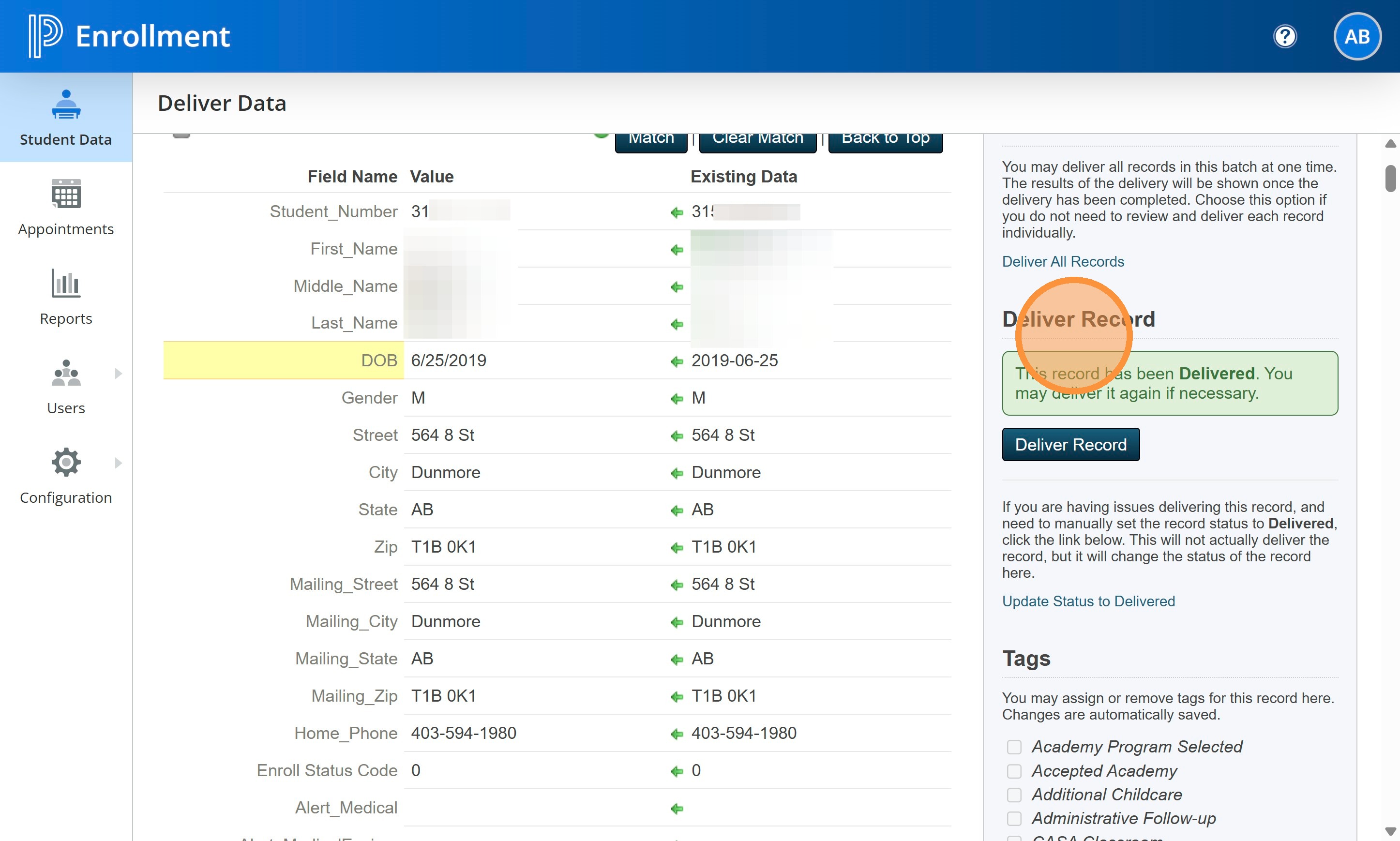 23. As you review the student for Delivery, you will want to pay attention to the lights beside the Match sections. In this case, the student was matched with one in SIS.
