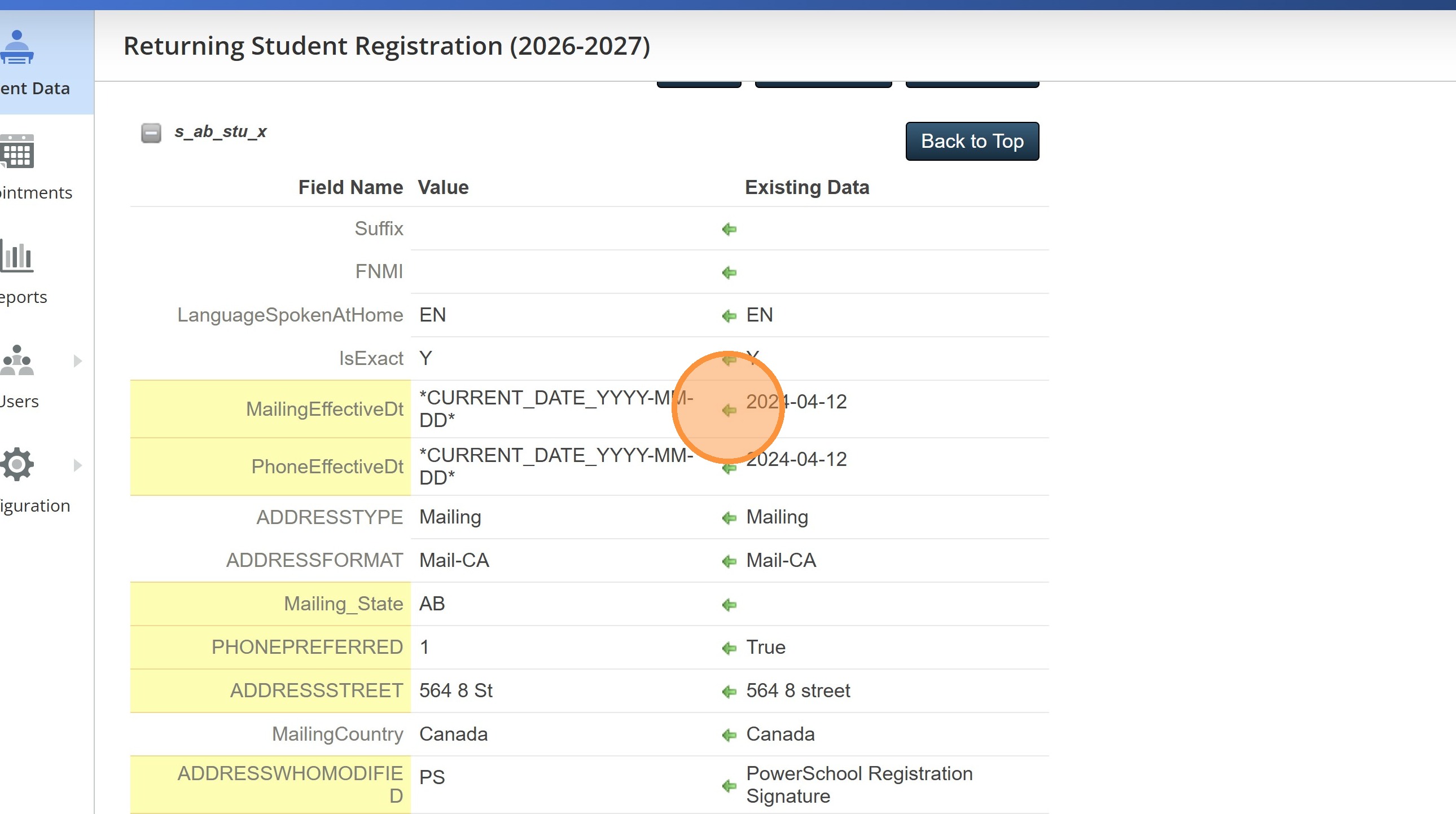 28. Move over the Existing Data dates for the Mailing and Phone effective dates in SIS. You can do this by clicking the green arrow.
