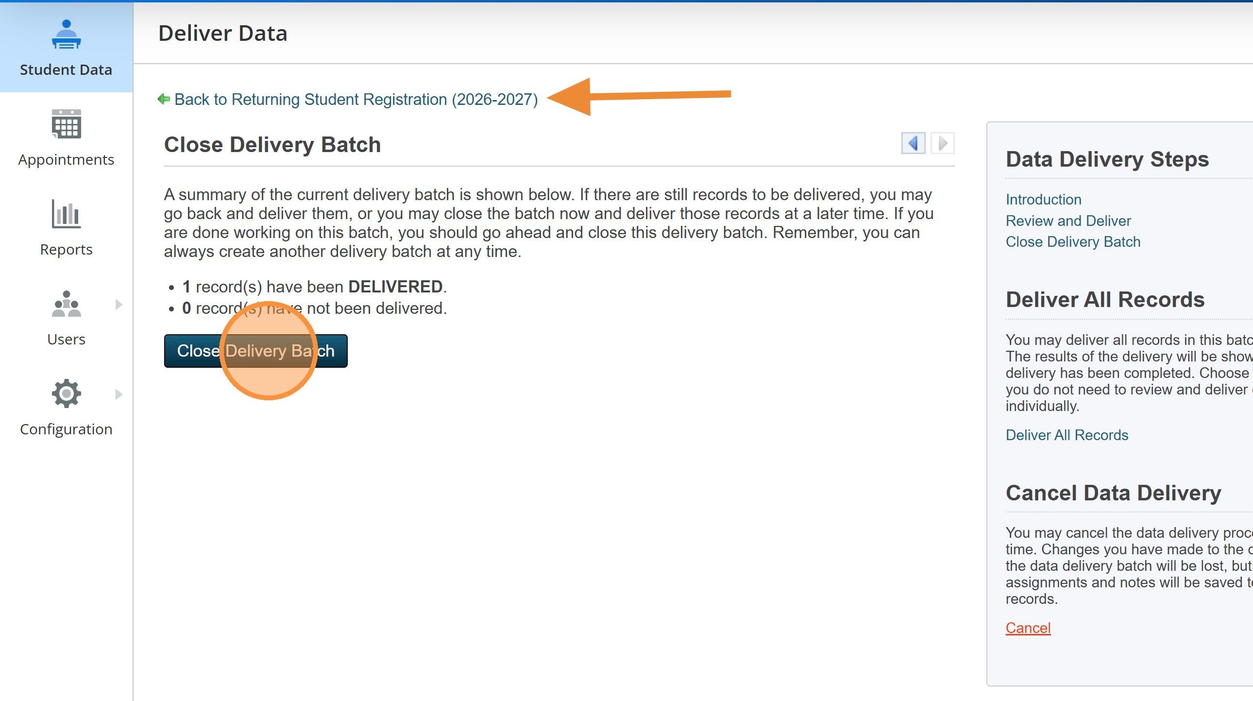 13. Click "Back to Returning Student Registration (2026-2027)"
