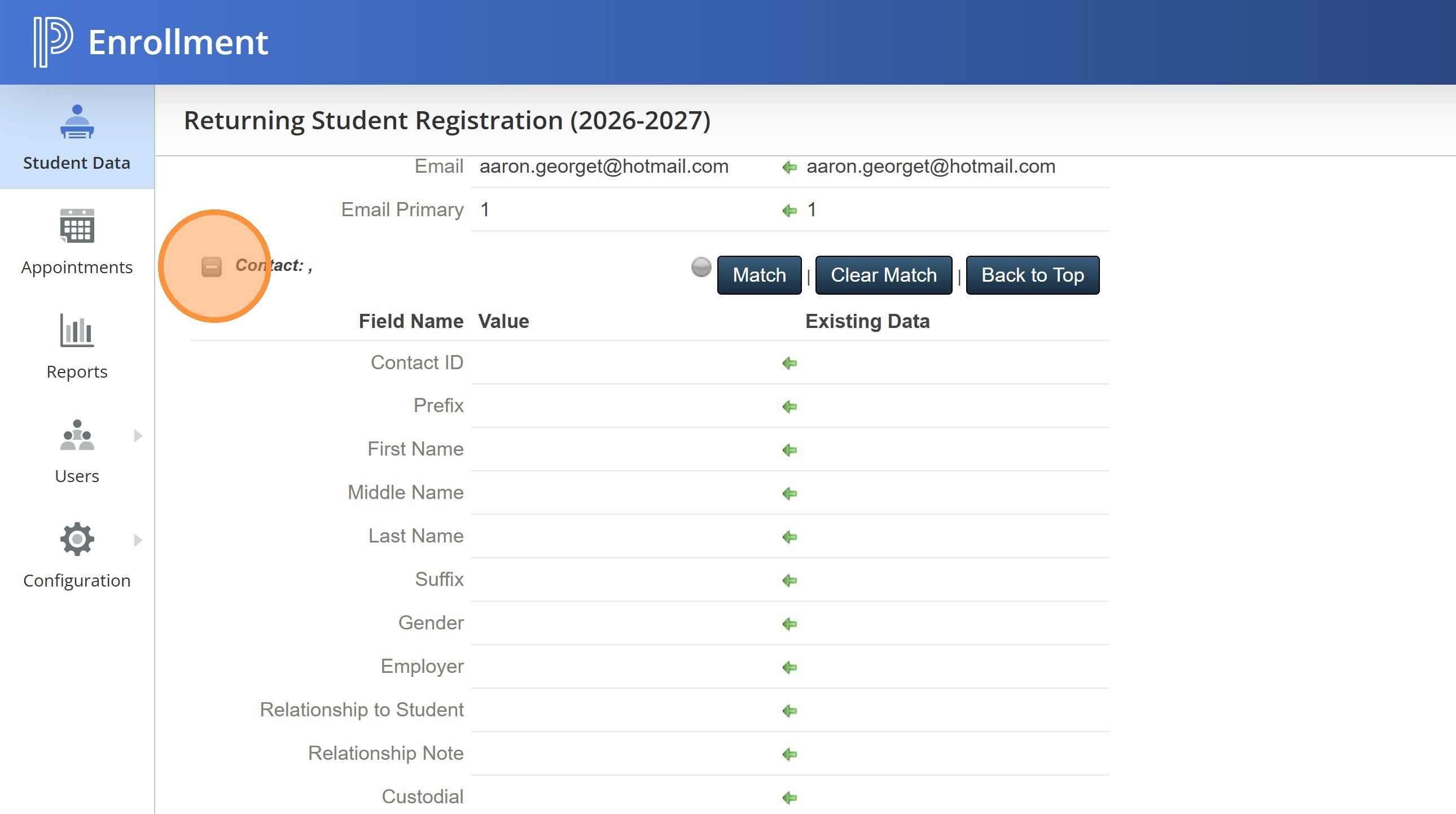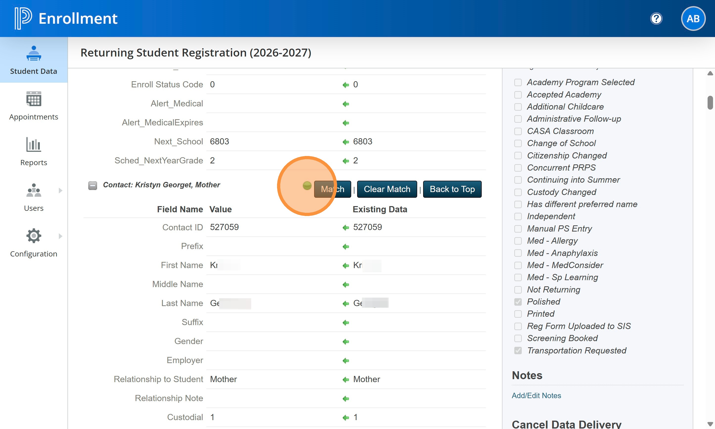 26. Watch your matches as you review the Contacts for the student. Sometimes we have parents with the same names or there have been duplicates created in the SIS. Parents who have provided the same phone or email for dad and mom will also show issues. If you need to review a Match (not green but a yellow circle), you can click on the Match button to try and match your parent with another contact.