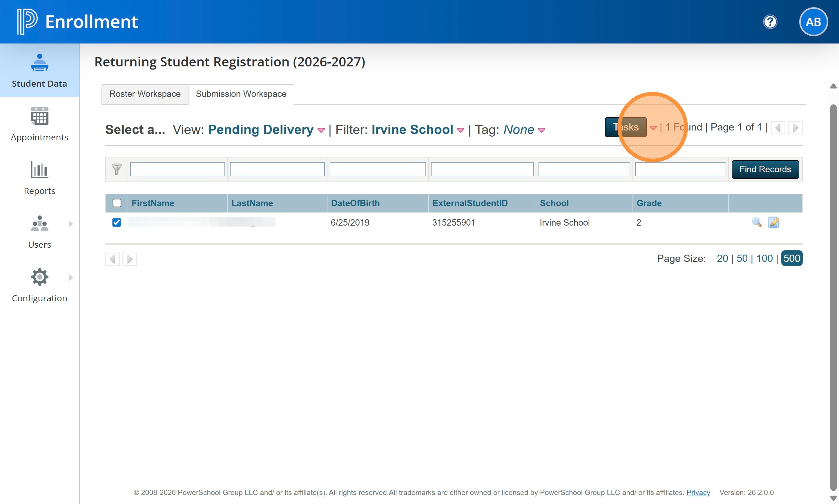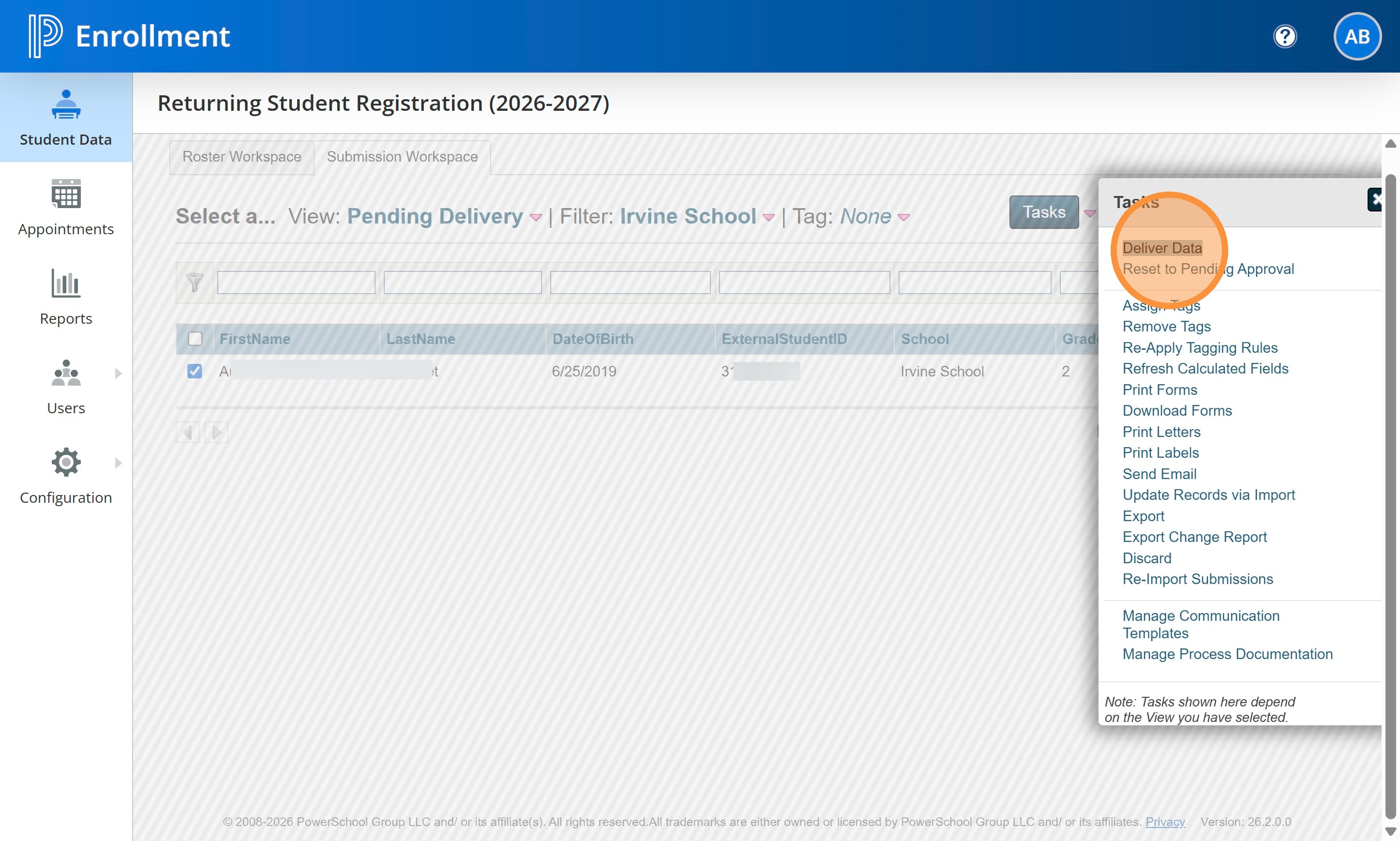 18. You can deliver a single student or run a group of students at one time. In this instance I checked the single student I want to deliver. After you do that, click on Tasks and choose Deliver Data.