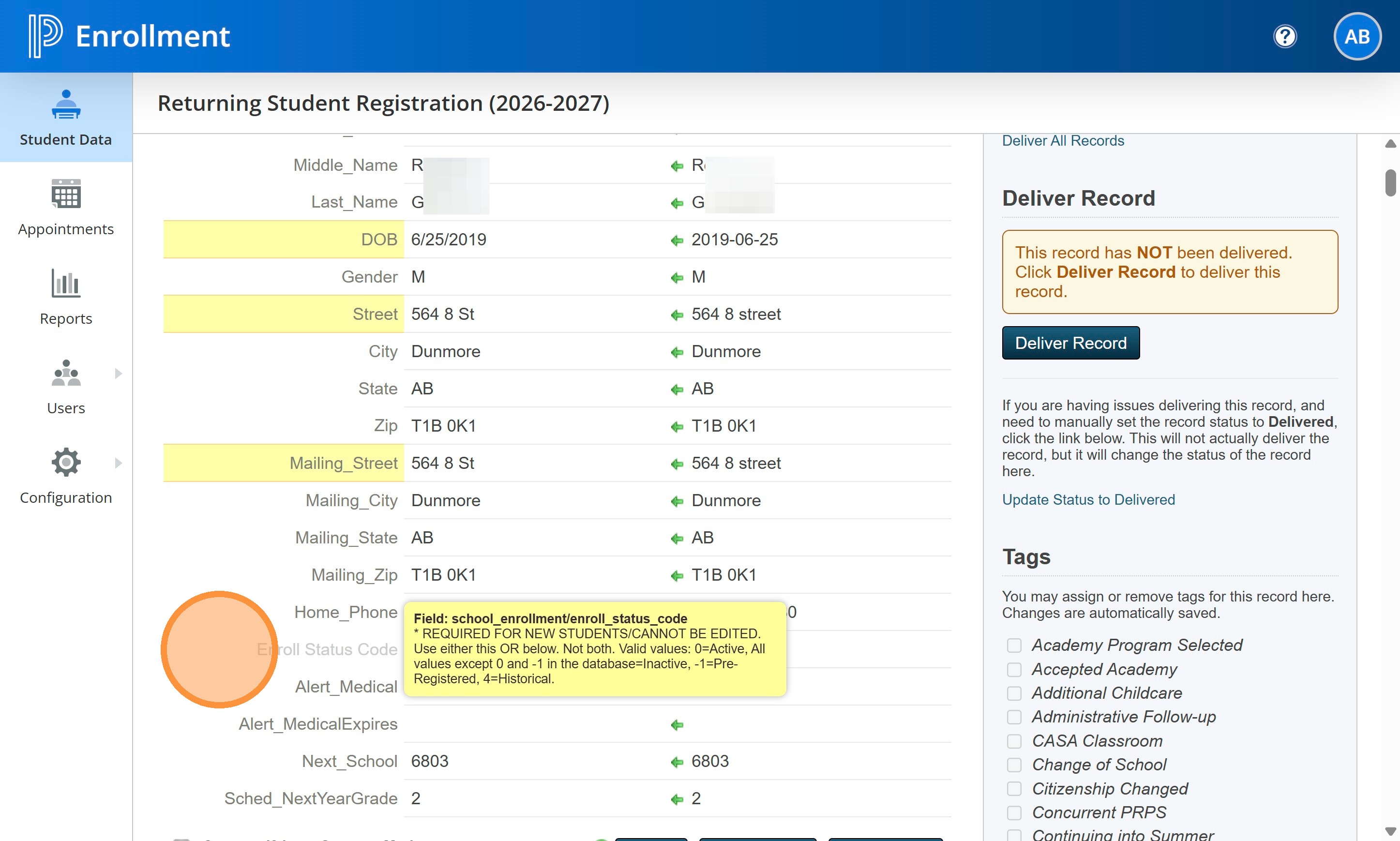 24. The form should default to Enroll Status Code 0. As these students are active, confirm it is set to 0.