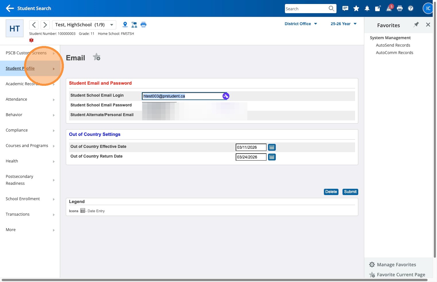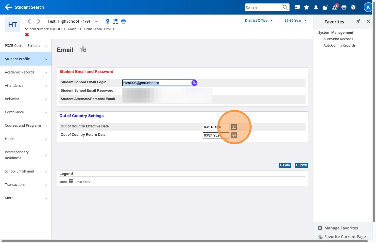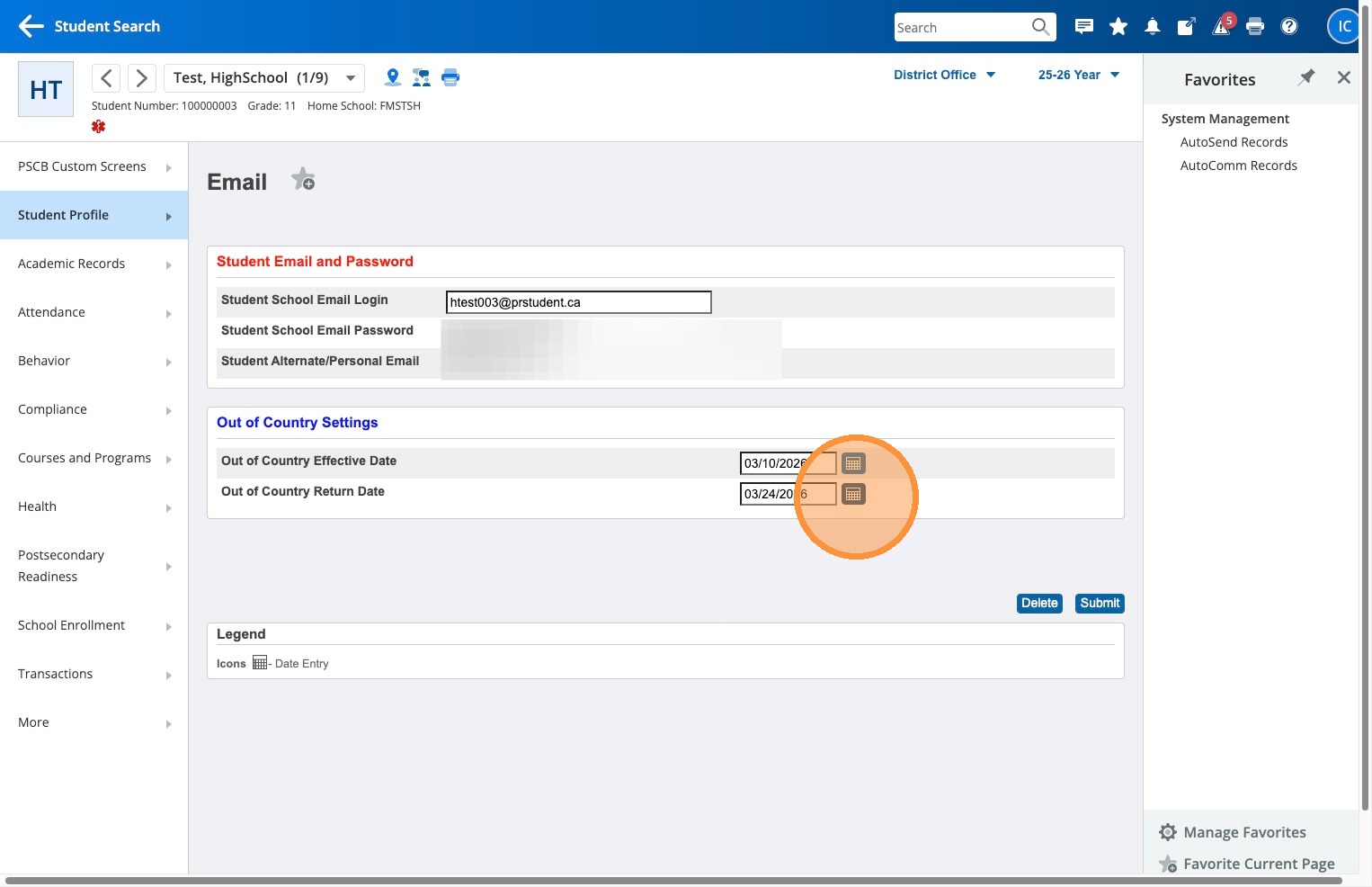 6. Under Out of Country Settings use the date picker beside Out of Country Effective Date to select the date the student will be leaving Canada.