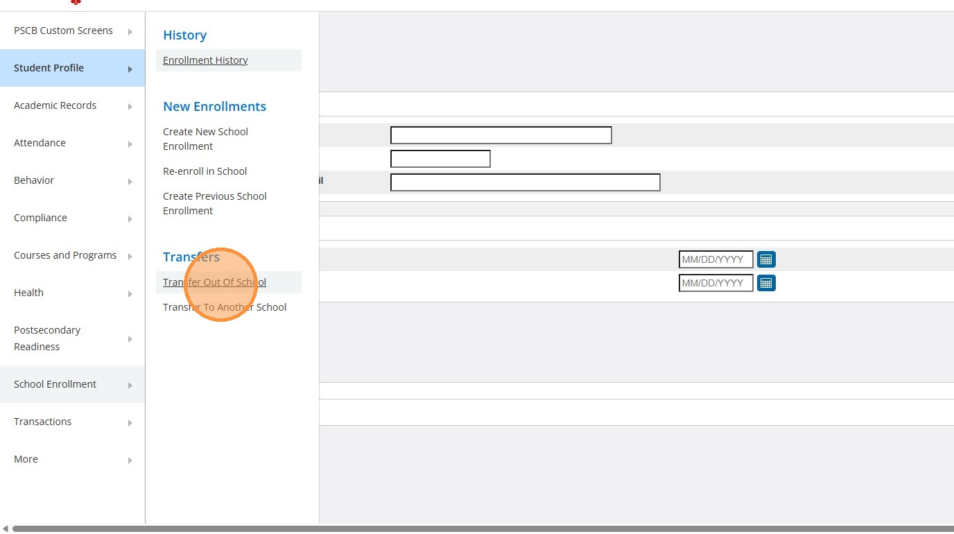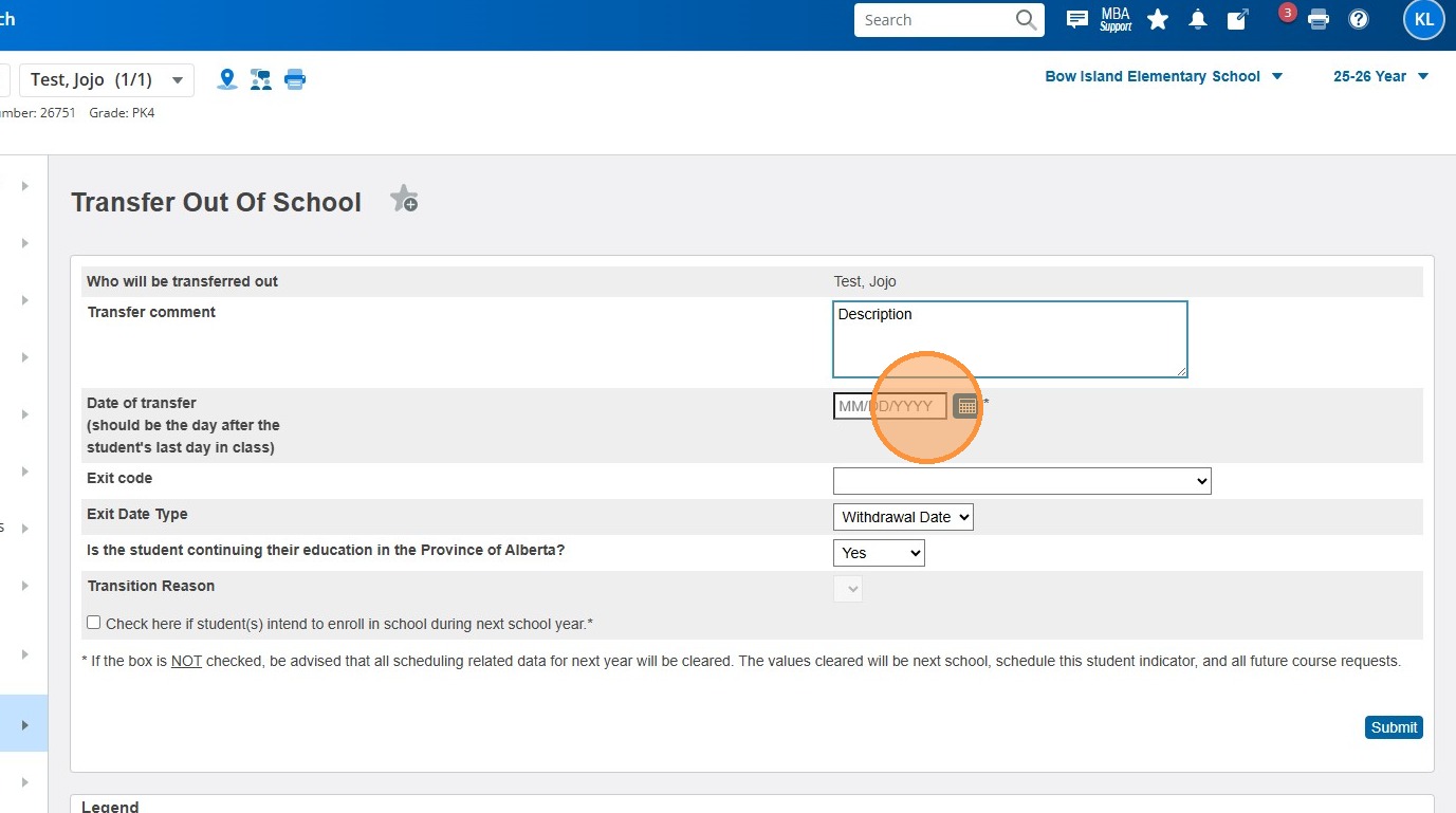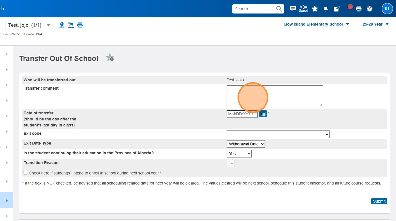 6. Enter the Date of Transfer (Exit Date). This should be the day after the last day the student was in class.