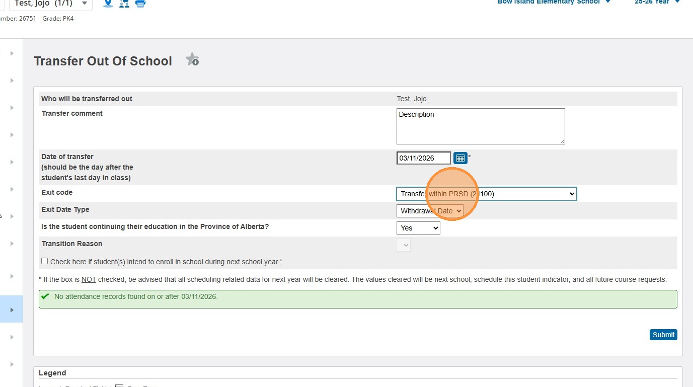 7. Select the Exit Code. Choose the one that makes the most sense. If the student will be moving to another PRPS school, choose "Transfer within PRSD (21100)" option.